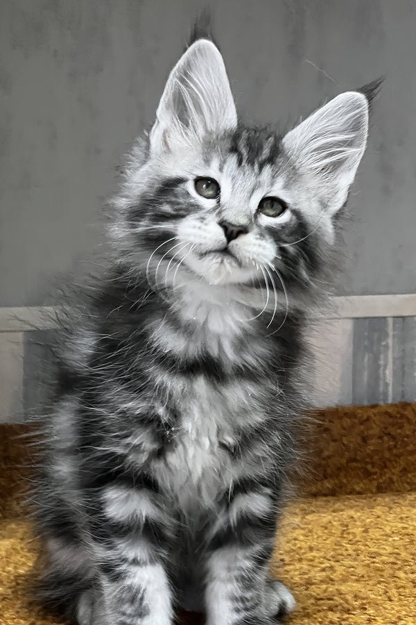 Glacier is a black smoke ticked tabby Maine Coon male with a rich dark coat woven over pale silver underlayers and striking gray eyes that give him a thoughtful expression. At 2 months old and weighing 5.5 lbs, he already shows strong bone structure, balanced proportions, and the solid presence expected of the breed.