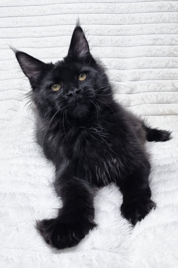Indie is a beautiful female Maine Coon kitten with a soft blue blotched tabby coat, glowing golden eyes, and elegant lynx tipped ears that give her a graceful forest cat appearance. Her thick plush fur, flowing tail, and balanced build reflect the impressive size and beauty the Maine Coon breed is known for. While she looks regal, Indie has a gentle and affectionate personality that makes her a wonderful companion.