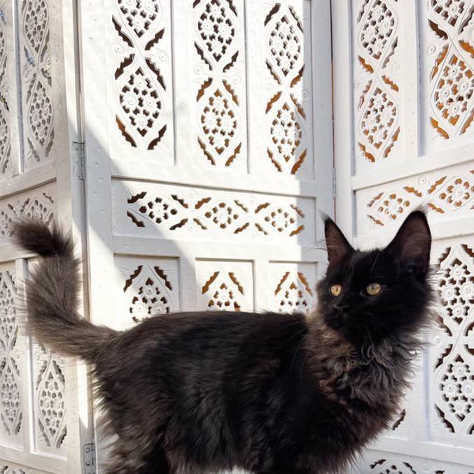 Meet Louis, a stunning Maine Coon female with a sleek black coat and gorgeous gold eyes. Born on May 30, 2024, she's now 10 months old and weighs 6.6 lbs. Her playful Gemini personality makes her a fun and affectionate companion.