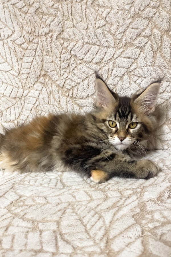 Trixitan is a striking black tortoise marble Maine Coon female with rich swirling patterns and a plush, expressive coat. At 3 months old and weighing 4.4 lbs, she is developing a strong frame and the impressive presence this gentle giant breed is known for.