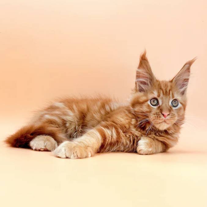 Meet Xavier, a striking Maine Coon male with a bold red coat and vivid green eyes. Born on June 9, 2024, he is now 11 months old and weighs 4.4 lbs.